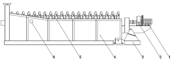 1.電機(jī) 2.減速機(jī) 3.設(shè)備底架 4.槽體 5.螺旋葉片 6.污水出口